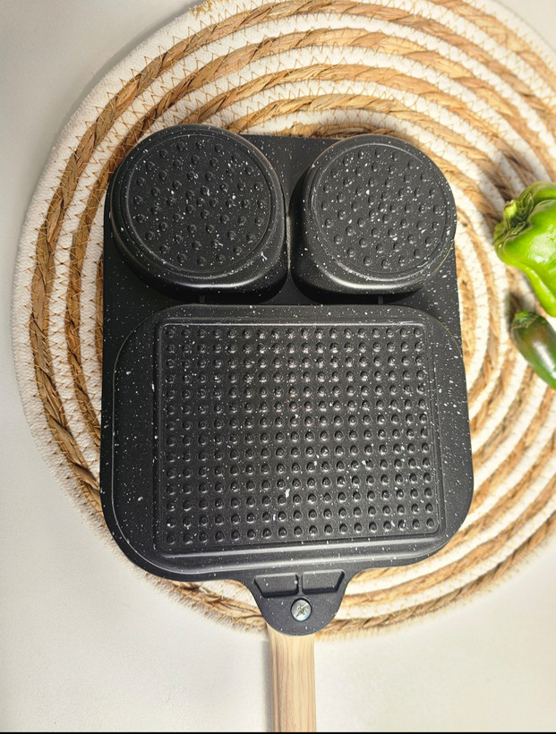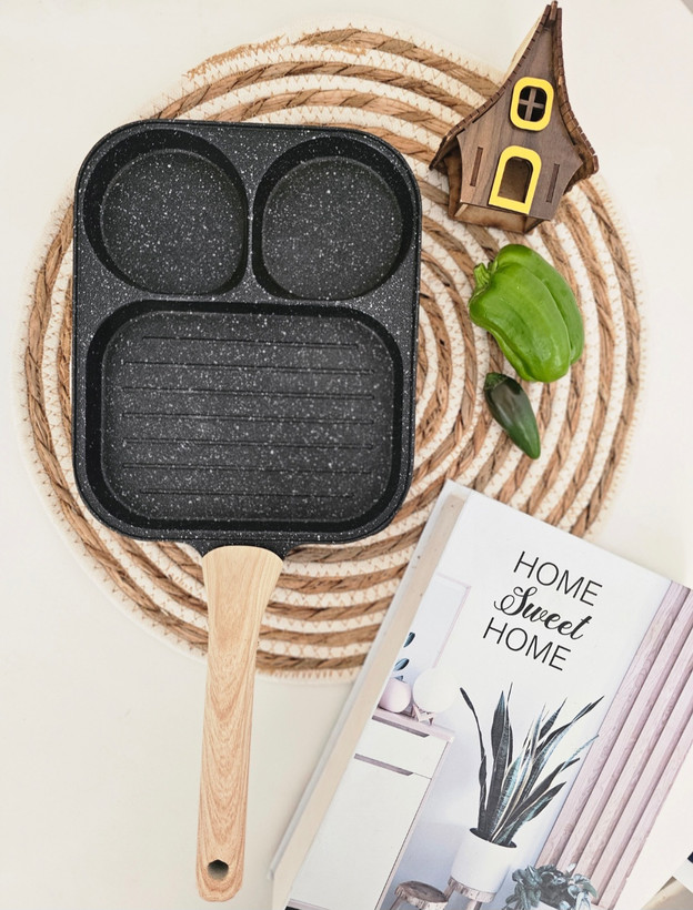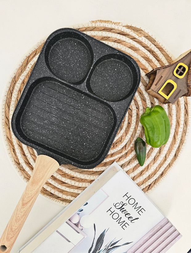 ماهیتابه 3 خانه گرد دسته دار طرح چوبی گرانیتی