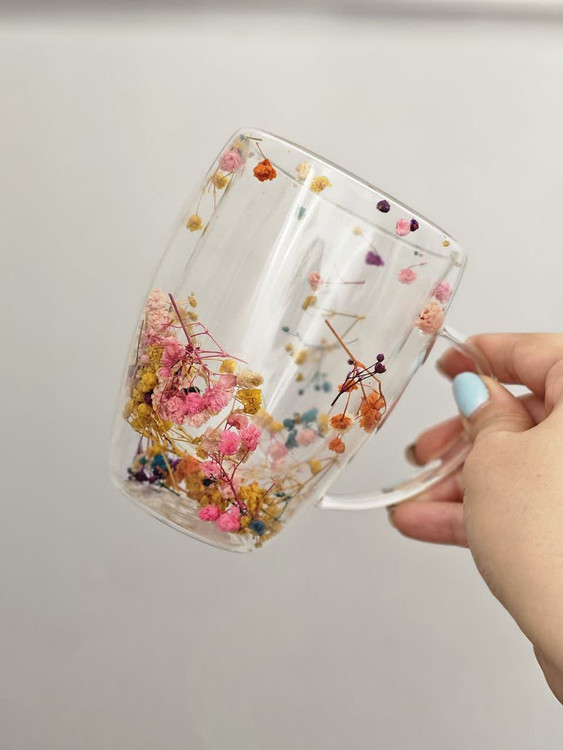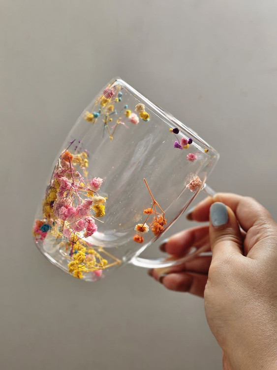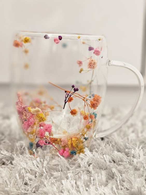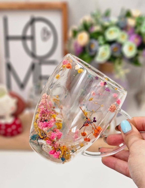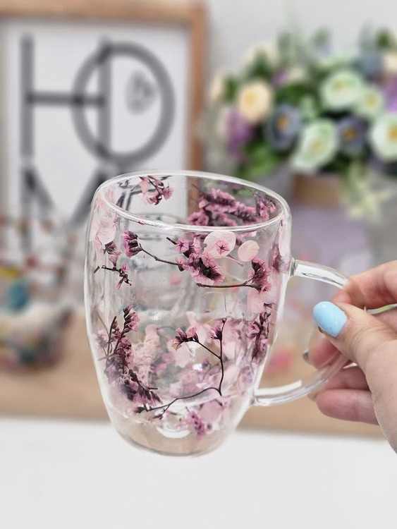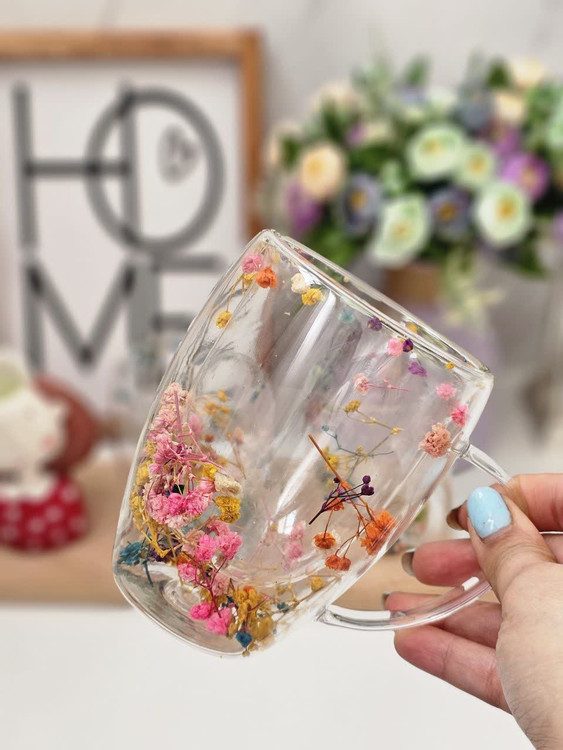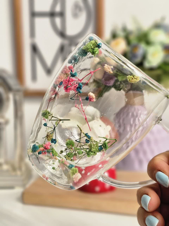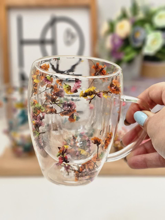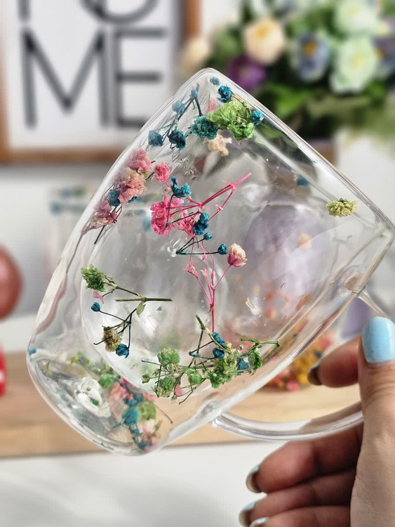 جنس پیرکس رنگ گلهای داخل جداره ها بصورت ادغامی میباشد بین دو جدار گلهای خشک وجود دارد که با تکان دادن لیوان حرکت میکنند مناسب جهت سرو انواع نوشیدنی گرم و سرد قابلیت استفاده در منزل، کافیشاپ ابعاد : قطر دهانه 8 سانتیمتر و ارتفاع 12 سانتیمتر